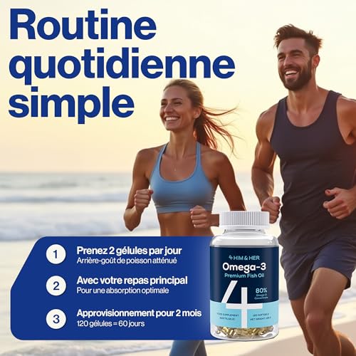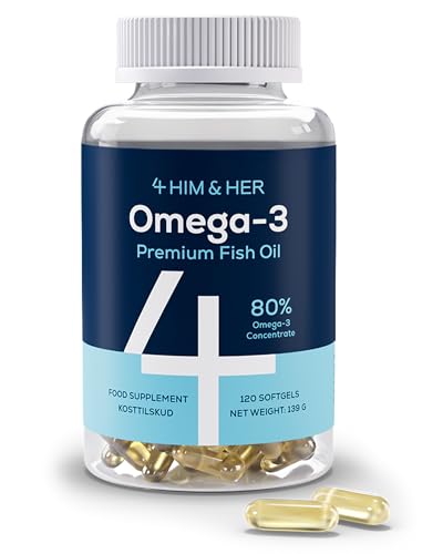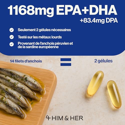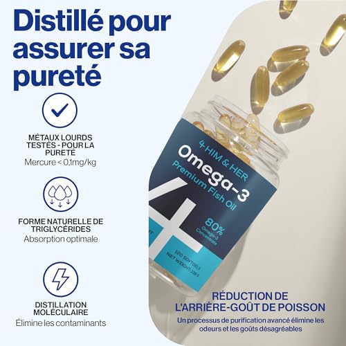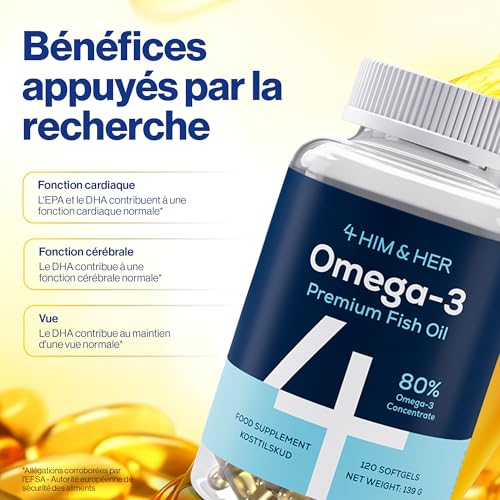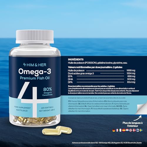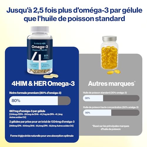 4 HIM & HER Gélules d’oméga-3 haute concentration – Huile de poisson oméga-3 concentrée à 80% – 668 mg d’EPA et 500 mg de DHA + 83,4 mg de DPA par dose – 120 gélules – Cure de 2 mois