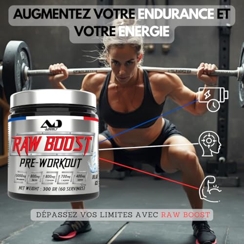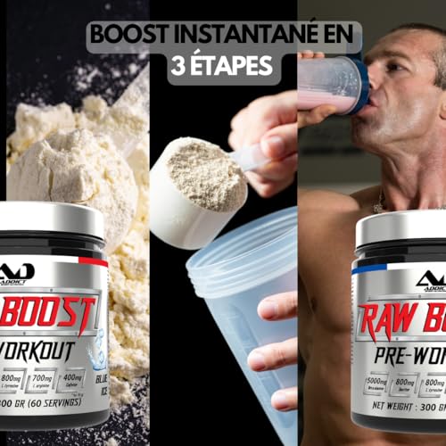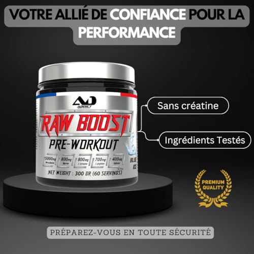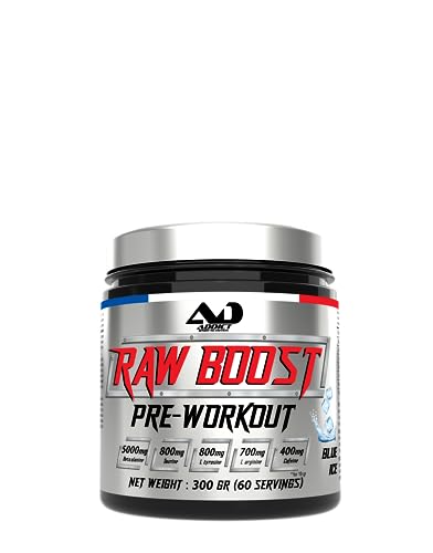 Addict sport nutrition – Pre workout raw boost 300g – Booster de pré-entraînement avec Bêta-Alanine, Taurine, L-Tyrosine, Caféine 200mg – Énergie pour l’entrainement (300 Gr, blue ice)