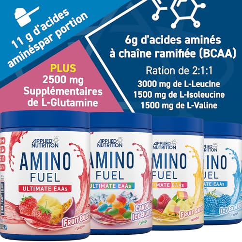 4 SAVEURS DÉLICIEUSES : la poudre Amino Fuel aux acides aminés essentiels est disponible dans une gamme de 4 saveurs différentes. Choisissez entre Framboise bleue glacée, Explosion de bonbons glacés, Explosion de fruits ou Salade de fruits. Vous pouvez en commander plusieurs pour varier les plaisirs