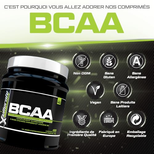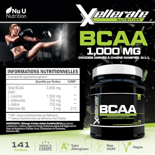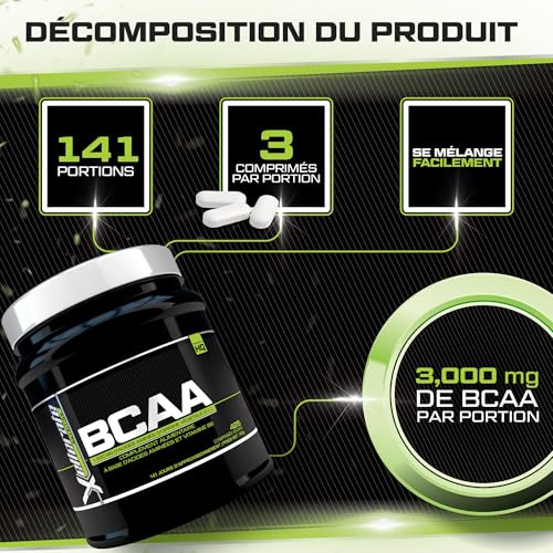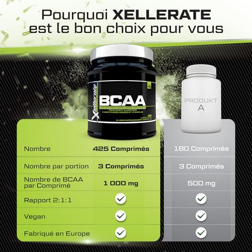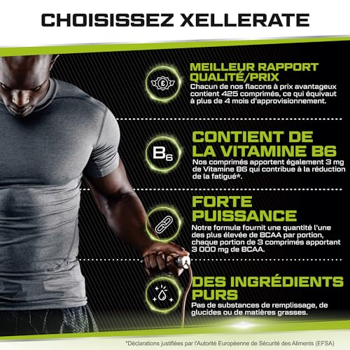 BCAA 2:1:1 3000mg – 425 Comprimés Végan – Acides Aminés à Chaîne Ramifié L-Leucine, L-Isoleucine, L-Valine et Vitamine B6 – Xellerate Nutrition