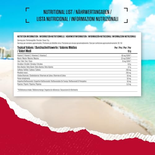 FR: INGRÉDIENTS : L-citrulline, bêta-alanine, acidifiants (acide L(+)-tartrique, acide citrique), antiagglomérants (dioxyde de silicium, silicate de calcium), arôme, caféine, acide L-ascorbique, extrait de racine de Rhodiola rosea, inuline, colorants (rouge de betterave, bêta-carotène), édulcorants (sucralose, acésulfame-K), bitartrate de choline, extrait de racine de Panax notoginseng, extrait de bioflavonoïdes de pamplemousse (Citrus paradisi, fruit), nicotinamide, oxyde de zinc, extrait de poivre noir (Piper nigrum, fruit).