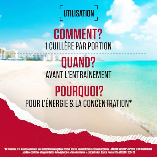 Complément alimentaire disponible en 3 parfums, sans colorants artificiels ; mélangez 3 dosettes dans 200 ml d’eau froide pour préparer une délicieuse boisson sportive avant votre séance