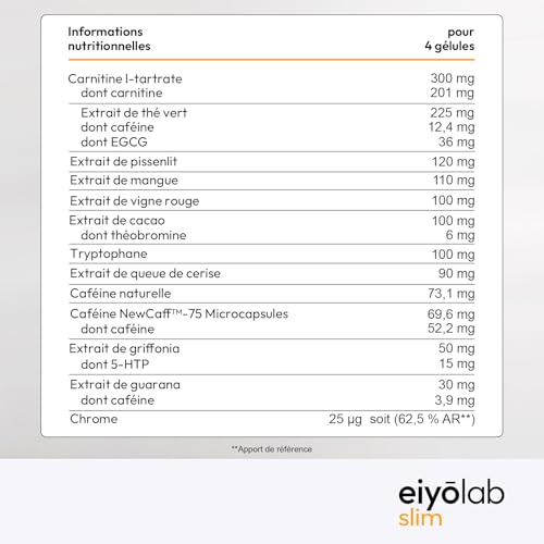 Gélule végétale, l-carnitine tartrate, agent de charge: carbonate de magnésium, extrait de feuille de thé vert (Camellia sinensis L. Kuntze) contenant du (-)-3- gallate d’épigallocatéchine, extrait de racine de pissenlit (Taraxacum campylodes G. .E.Haglund), extrait de fruit de manguier (Mangifera indica L.), extrait de feuille de vigne rouge (Vitis vinifera L.), extrait de graine de cacao (Theobroma cacao L.), l-tryptophane, extrait de queue de cerise (Prunus cerasus L.), caféine naturelle, caféine NewCaff™- 75 Microcapsules (caféine, mono et di-glycérides d’acides gras), extrait de graine de griffonia (Griffonia simplicifolia DC Baill), extrait de graine de guarana (Paullinia cupana Kunth), lubrifiant: huile de tournesol, picolinate de chrome