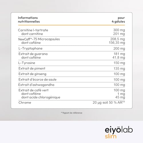 Gélule végétale, agents de charge: fibre de gomme d’acacia et carbonate de magnésium, l-carnitine tartrate, caféine NewCaff™-75 Microcapsules (caféine, mono et di-glycérides d’acides gras), l-tryptophane, extrait de graine de guarana (Paullinia cupana Kunth), l-tyrosine, extrait de fruit de piment doux (Capsicum annuum L.), extrait de racine et de feuille de ginseng (Panax ginseng C.A Meyer), extrait d’écorce de saule (Salix alba L.), extrait de racine d’ashwagandha (Withania somnifera L.), extrait de graine de café vert (Coffea arabica L.), lubrifiant: huile de tournesol, picolinate de chrome.