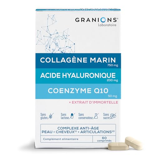 Spécification: COLLAGENE et Acide Hyaluronique – GRANIONS Collagène N°1 en Pharmacies- Collagene Marin Peau, Cheveux, Articulations, Ongles – Coenzyme Q10 – Acide Hyaluronique – 60 Comprimés – 1 mois
