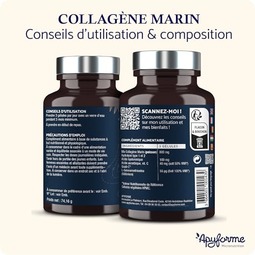 💊 POSOLOGIE, NOS EXPERTS VOUS CONSEILLENT : Prenez 3 gélules par jour avant un repas avec un verre d’eau. Sans odeur et neutre en goût, intégrez facilement le Collagène Marin Apyforme dans votre routine pour des bénéfices durables sur votre bien-être.