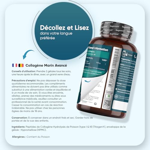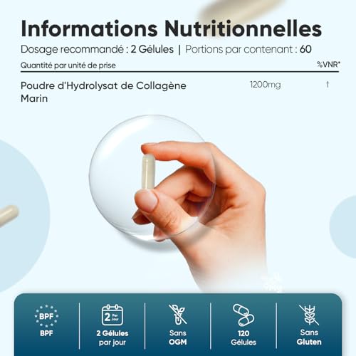 Collagene au Quotidien – Il est recommandé de consommer 2 gélules de Collagene Marin type 1 et 3 par jour avec un verre d’eau, de préférence pendant un repas. Les gélules peuvent également être ouvertes et la poudre mélangée dans une boisson, selon les préférences. Il est conseillé de prendre les gélules à la même heure chaque jour pour une routine régulière.