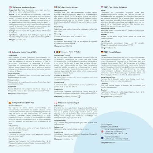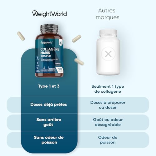 Collagène Marin 100% Pur – Le flacon contient du collagène marin hydrolysé 100% pur de type 1 et type 3. À raison de 2 gélules de Collagène Marin par jour, le Collagène marin de WeightWorld a un dosage de 1200mg de Collagène Marin type 1 et 3 pour 2 mois d’approvisionnement.