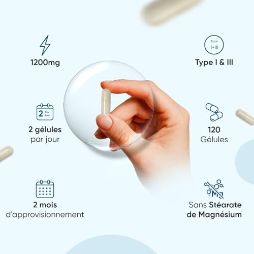 Spécification: Collagène Marin Hydrolysé 100% Pure Type 1 et 3, 1200mg 120 Gélules, Peptides de Collagène Hydrolysé Alternative À La Poudre, Sans OGM, Sans Gluten et Sans Stéarate de Magnésium