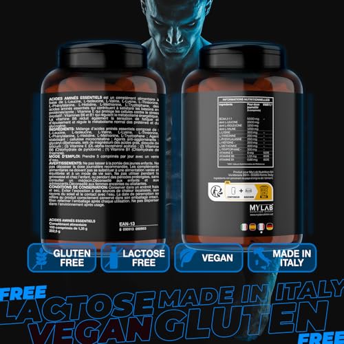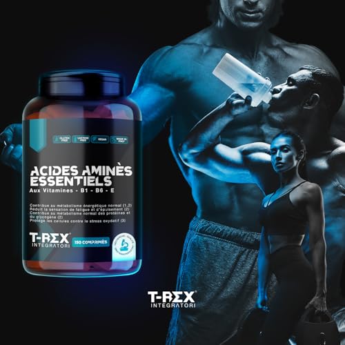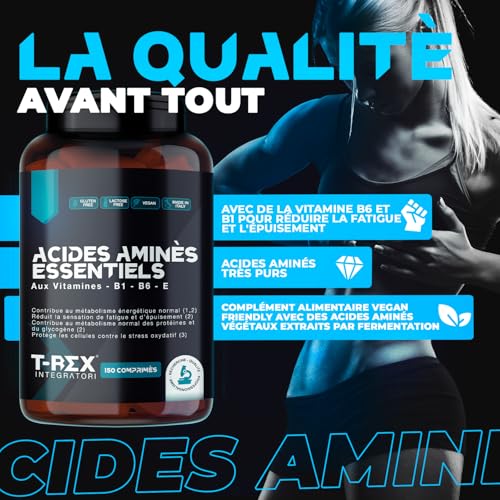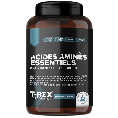 EAA Essential Amino Acids – avec mélange de vitamines B1, B6 et E – Supplément Végétalien d’Acides Aminés Essentiel Naturels Obtenus par Fermentation. T-Rex Integratori (150 Comprimés)
