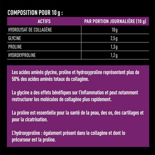 L’hydrolysat de collagène est hautement dosé et très assimilable par l’organisme. Le collagène est naturellement présent dans la structure des tendons et des ligaments.