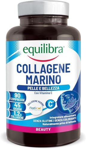 COLLAGÈNE MARIN Equilibra® est un complément alimentaire en comprimés à base de collagène marin hydrolysé de la marque Naticol®, source naturelle de collagène de type I et III. Le collagène est une substance naturellement présente dans l’organisme, utile pour maintenir la tonicité et l’élasticité de la peau, ainsi qu’à prévenir le vieillissement. La formulation est enrichie en Vitamine C, qui contribue à la formation normale de collagène pour assurer la fonction normale de la peau.