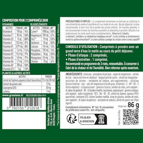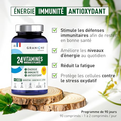 Spécification: GRANIONS 24 VITAMINES – Multivitamines et Minéraux – Magnesium, Zinc, Vitamine C, Selenium, Coenzyme Q10, Luteine – Energie, Immunité – Vitamines Adultes – 90 Comprimés – 3 MOIS – Fabriqué en FRANCE