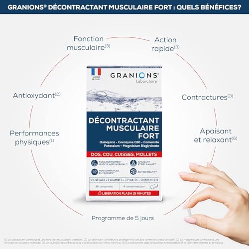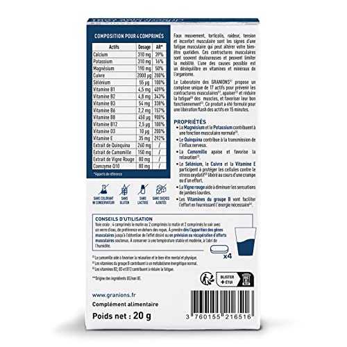 Spécification: GRANIONS Décontractant Musculaire Fort | Apaise les contractures du dos, cou, cuisses, mollets I Douleurs Intenses | 5 minéraux, 8 vitamines, 3 plantes | Co-enzyme Q10 | Action rapide 15min | 20 comp
