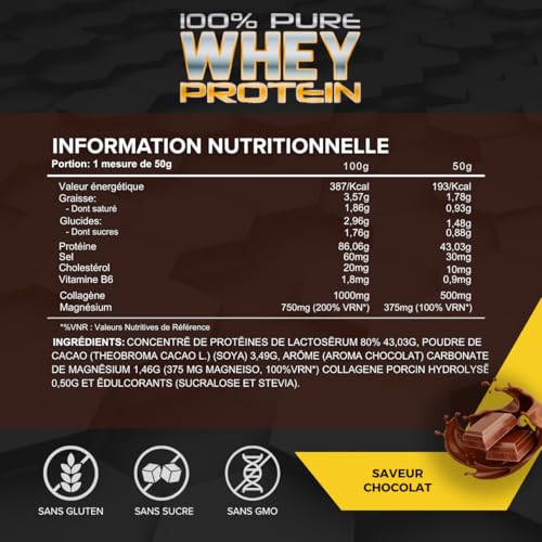 INGRÉDIENTS: Protêine de LACTOSÉRUM 80 % 43 034 g; cacao dégraissé; parfum de chocolat; Carbonate de Magnésium 1.464g (375.22 Mg de Magnésium 100% VRN*), Collagène 500mg; Édulcorant: Sucralose et Stevia.