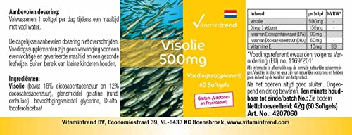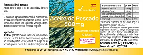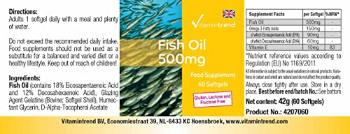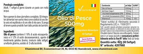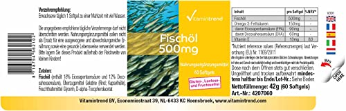 Huile de poisson 500 mg – 60 softgels, Source naturelle d’acides gras oméga-3, 18% EPA et 12% DHA, Dosage sûr | Vitamintrend®