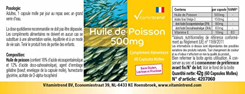 ✅ VITAMINTREND Complément alimentaire. Un softgel contient : 500mg d’huile de poisson avec 150mg d’acides gras oméga-3, dont 90mg d’acide eicosapentaénoïque (EPA) et 60mg d’acide docosahexaénoïque (DHA). Avec 10 mg de vtamine E naturelle par softgel, l’huile de poisson est bien protégée contre l’oxydation. Dose journalière recommandée : Adultes, 1 capsule molle par jour au repas avec un grand verre d’eau. – Dosage sûr – Excellent rapport qualité-prix