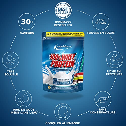 Spécification: IronMaxx 100% Whey Protein – Protéines de Lactosérum en poudre, hydrosolubles – Goût Cookies et Crème – 1 x sac de 500 g