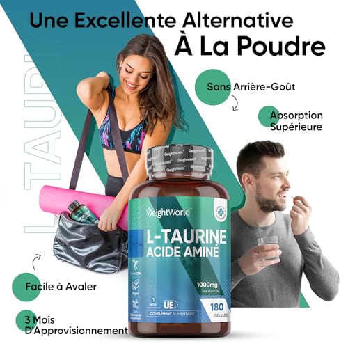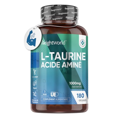 L-Taurine 1000mg Par Portion – 180 Taurine Gelules Vegan (3 Mois) – Taurine Pure Acide Aminé pour Sportifs – Nutrition Workout, Pre & Post-Entraînement, Sans Stéarate de Magnesium, WeightWorld