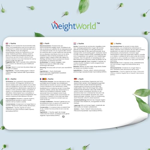 Spécification: L-Taurine 1000mg Par Portion – 180 Taurine Gelules Vegan (3 Mois) – Taurine Pure Acide Aminé pour Sportifs – Nutrition Workout, Pre & Post-Entraînement, Sans Stéarate de Magnesium, WeightWorld