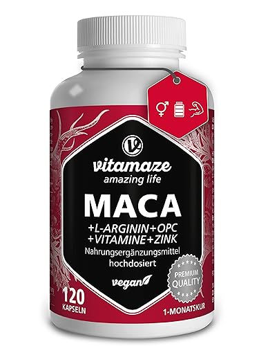 Maca Complex 5000mg – Énergie Booster, Circulation, Endurance, avec L-Arginine + Vitamines B6, B12 + OPC + Zinc -120 Vegan Capsules