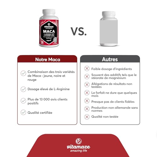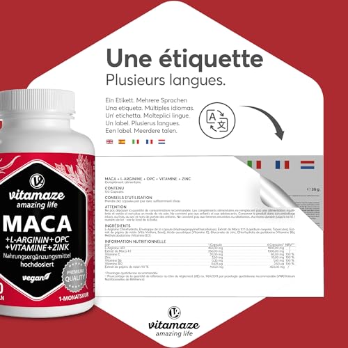 Spécification: Maca Complex 5000mg – Énergie Booster, Circulation, Endurance, avec L-Arginine + Vitamines B6, B12 + OPC + Zinc -120 Vegan Capsules