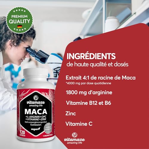 HAUTEMENT DOSÉ : 120 gélules végétales pour une utilisation continue d’un mois avec 5 000 mg de racine de Maca (extrait 10:1) par dose quotidienne à la taille normale de la gélule. Formule VITALE avec B6, B12, OPC (extrait de pépins de raisin) et zinc. La combinaison idéale de L-Arginine et d’OPC dans le rapport 4:1 est unique sur le marché !