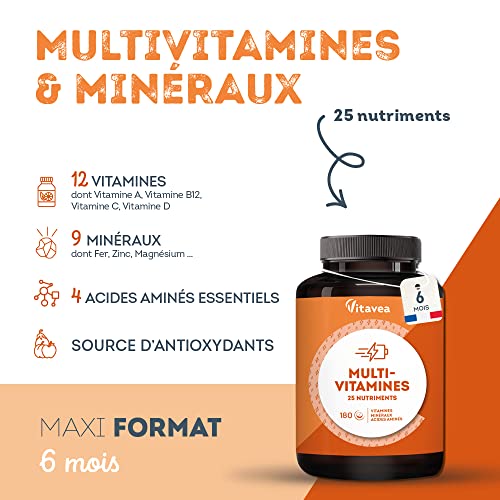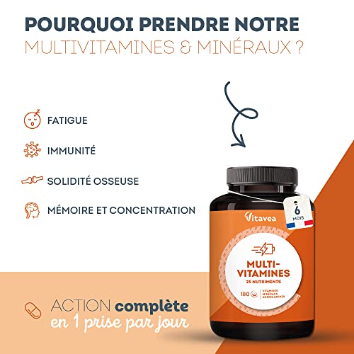 Spécification: Multivitamines et Minéraux | 25 nutriments dont Vitamine A B C D E, Zinc et Fer | 180 comprimés | Immunité, Fatigue, Cheveux, Peau | Multivitamines Homme et Femme | Fabriqué en France | Vitavea