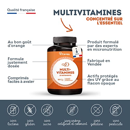🚀 FORMULE COMPLÈTE TRIPLE ACTION : Le complément alimentaire Vitavea Multivitamines et minéraux apporte au quotidien et dans 1 seul comprimé, tous les nutriments et vitamines essentiels pour apporter un coup de boost et renforcer les défenses naturelles. Il est idéal lors des changements de saison. Nos vitamines adulte (vitamine C, vitamine D, vitamine E, vitamine B12) au bon goût d’orange sont formulées sans sucres, lactose et gluten.