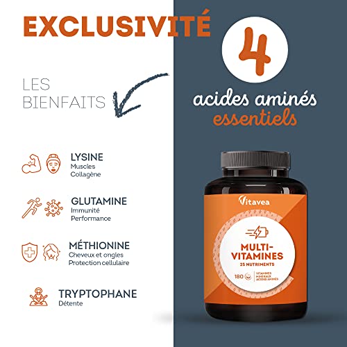 Complément alimentaire Multivitamines – 25 nutriments La formule Multivitamines VITAVEA est votre alliée pour maintenir l’énergie et renforcer votre immunité. Multivitamines VITAVEA est un complément alimentaire formulé avec 25 nutriments. Notre formule Multivitamines contient 12 vitamines justement dosées, 9 minéraux reconnus dans la sphère du tonus et 4 acides aminés essentiel. Notre formule Multivitamines peut être prise toute l’année, lors des changements de saison ou pendant une période de fatigue passagère ou intense. Détails du produit : Le complément alimentaire Multivitamines aide à : Réduire la fatigue au quotidien (Vitamines B2,B3, B5, B6, B9, B12, C) Contribuer au fonctionnement normal du système immunitaire (Vitamines B6, B12, C, D, Cuivre, Fer, Zinc, Sélénium) Contribuer à un métabolisme énergétique normal (Vitamines B1, B2, B3, B5, B6, B12, C, Cuivre, Fer) A propos de Vitavea : Vitavea, spécialiste du bien-être au naturel, vous propose une large gamme de produits pour prendre soin de vous. Nous avons à cœur de vous accompagner dans votre démarche bien-être et de vous permettre de trouver le produit qui répond à vos besoins. Accessibles à tous, faciles d’utilisation, nos produits s’intègrent idéalement dans votre vie quotidienne. Tous nos produits sont fabriqués en France, vous garantissant qualité et respect des processus de fabrication. Avec Vitavea, le bien-être et la santé sont à portée de main. Ingrédients : Agent de charge : sorbitol ; minéral : oxyde de magnésium ; vitamines : C, E ; minéral : bisglycinate de fer ; vitamine B3 ; arôme citron (arôme naturel de citron avec d’autres arômes naturels) ; L-lysine ; L-tryptophane ; L-glutamine ; méthionine ; levure séléniée (Saccharomyces cerevisiae) ; vitamine B5 ; minéral : oxyde de zinc ; anti-agglomérant : sels de magnésium d’acides gras ; vitamines : A, B12, D, B6, B2, B1, B9 et B8 ; minéraux : sulfate de manganèse, citrate de cuivre, picolinate de chrome, molybdate de sodium et iodure de potassium. Teneur en actifs pour 1 comprimé : Vitamine A : 400µg (50%VNR) Vitamine D : 5µg (100% VNR) Vitamine E : 6mg (50% VNR) Vitamine C : 40mg (50% VNR) Vitamine B1 : 1.1mg (100% VNR) Vitamine B2 : 1.4mg (100% VNR) Vitamine B3 : 16mg (100% VNR) Vitamine B5 : 6mg (100% VNR) Vitamine B6 : 1.4mg (100% VNR) Vitamine B8 : 50µg (100% VNR) Vitamine B9 : 200µg (100% VNR) Vitamine B12 : 2.5µg (100% VNR) Fer : 3.5mg (25% VNR) Magnésium : 56.26mg (15% VNR) Zinc : 5mg (50% VNR) Iode : 75µg (50% VNR) Cuivre : 0.5mg (50% VNR) Manganèse : 1mg (50% VNR) Chrome : 36µg (90% VNR) Sélénium : 13.75µg (25% VNR) Molybdène : 50µg (100% VNR) L-lysine : 10mg L-glutamine : 10mg Méthionine : 10mg L-tryptophane : 9.5mg VNR = Valeurs nutritionnelles de référence Conseils d’utilisation : 1 comprimé par jour, à avaler avec un grand verre d’eau Précautions d’emploi : Ne pas dépasser la dose recommandée. À consommer dans le cadre d’une alimentation variée et équilibrée et d’un mode de vie sain. À conserver dans un endroit sec et frais. Garder hors de portée des enfants. Réservé à l’adulte. Une consommation excessive peut avoir des effets laxatifs. Ne pas consommer en même temps que d’autres produits contenant de la vitamine A. Déconseillé aux femmes ménopausées et chez la femme enceinte ou désireuse de l’être. Déconseillé aux personnes souffrant de troubles de la thyroïde.