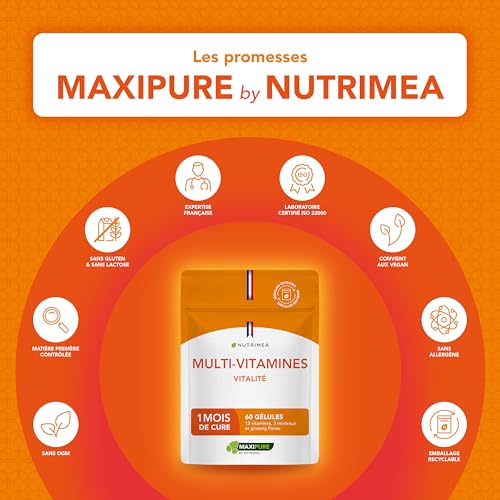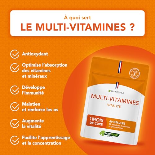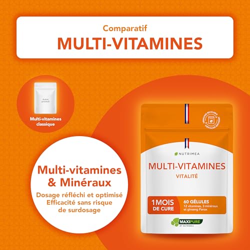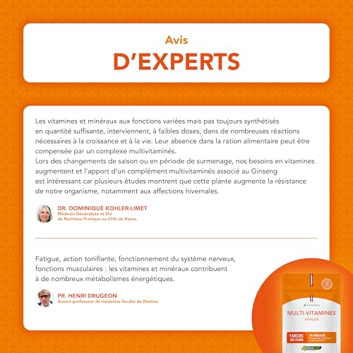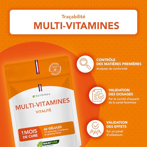 Spécification: Multivitamines et Minéraux – Avec Ginseng – Vitamines A, B1, B2, B3, B5, B6, B8, B9, B12, C, D3, E, Magnésium, Sélénium et Zinc – Energie, Vitalité, Immunité – Fabrication Française – Nutrimea