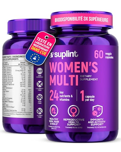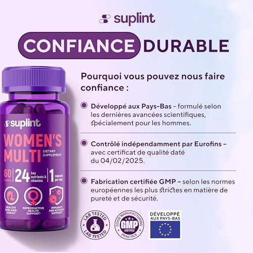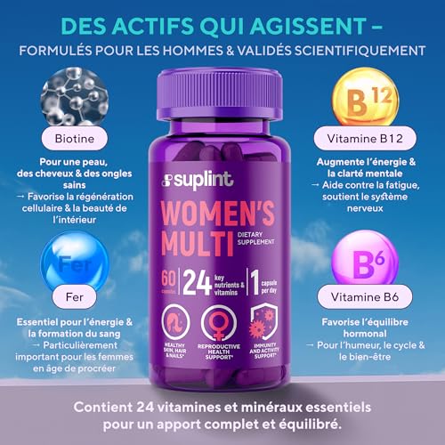 ✨ FORMULE MULTIVITAMINÉE COMPLÈTE POUR FEMMES: Un mélange de vitamines et minéraux essentiels, dont les vitamines A, C, D, E, B12, zinc et biotine – conçu pour soutenir la vitalité et le bien-être quotidien.