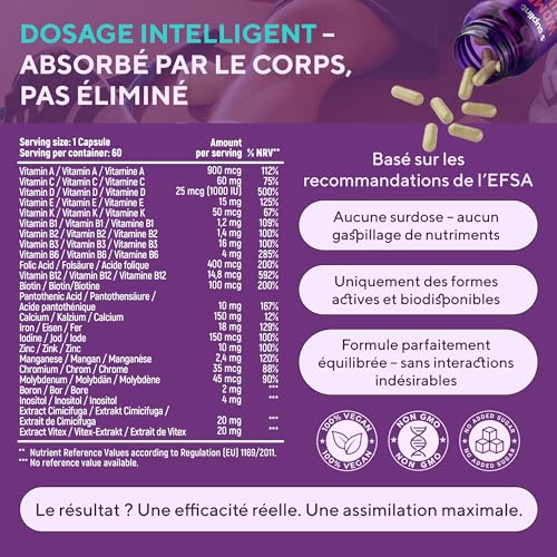 Spécification: Multivitamines et Minéraux Femme – Complexe avec Vitamine A C D E B12, Biotine, Zinc | Complément Alimentaire Beauté & Bien-Être | Cheveux, Peau, Ongles | 60 Gélules Vegan Sans Gluten et OGM