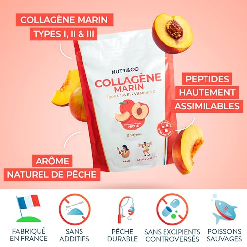 Spécification: NUTRI & CO Collagène Marin Types 1 2 3 + Vitamine C – Peau & Articulations – 5500mg de Collagène Hydrolysé Breveté par Portion – Peptides en Poudre Goût Pêche 180g – Fabriqué en France