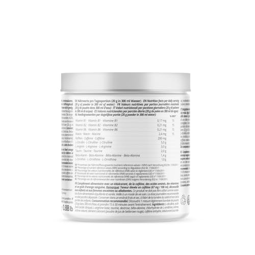 Spécification: Nutri + Pre-Workout Booster Blood Orange – hautement dosé + vegan – Caféine Citrulline L-Arginine Creapure ß-Alanine Bétaïne HCL 400 g