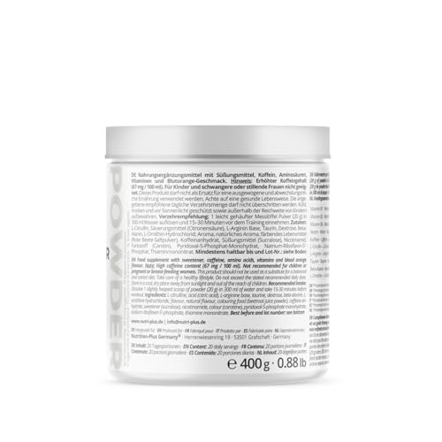 Nutri + Pre-Workout Booster Blood Orange – hautement dosé + vegan – Caféine Citrulline L-Arginine Creapure ß-Alanine Bétaïne HCL 400 g