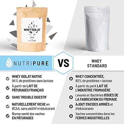 Spécification: Nutripure | Whey Isolate Native en Poudre | Complément Alimentaire à base de Protéines de Lait | Développement Musculaire & Musculation | 94% Protéines, 25% BCAA, 52% EAA | Neutre | 750 gr | France
