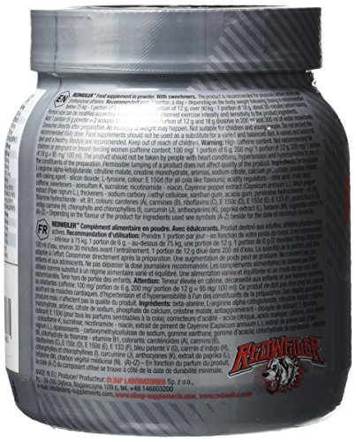 Redweiler contient béta-alanine, L’arginine alpha-cétoglutarate (AAKG), citruline malate, créatine monohydrate, L-tyrosine, caféine, extrait de poivre de Cayenne (Capsicum annuum L.), extrait de poivre noir (Piper nigrum L.) Bioperine