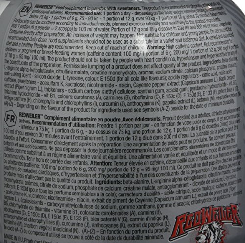 Une technologie de pointe, la transparence des matières premières, de nombreuses années d’expérience et la qualité supérieure des ingrédients, établissent la garantie des effets réels des compléments alimentaires de la marque Olimp Sport Nutrition. Redweiler en est un parfait exemple! C’est un supplément pré-entraînement révolutionnaire qui vous permettra d’accomplir un entraînement à « fond la caisse », réduisant (grâceà la vitamine B6) les symptômes d’une fatigue croissante. La formule de ce pré-entraînement, mis au point par les spécialistes de la société pharmaceutique Olimp Laboratories est basée sur trois complexes extrêmement puissants de principes actifs très efficaces, afin d’augmenter vos capacités face à un effort physique intense. Les deux formes de créatine associées à la caféine vous aideront à surmonter la stagnation dans l’entraînement et à aboutir à une condition du champion! Redweiler est une préparation qui fera de chaque défi un jeu d’enfant! Vous voulez des résultats au top? Préférezun supplément plébiscité pardes dizaines de sportifs! Optant pour Redweiler vous réveillerez la bête qui est en vous! Laissez-vous en convaincre! Redweiler c’est: Ingrédients testés de haute qualité Réduction de la fatigue (vit. B 6 )