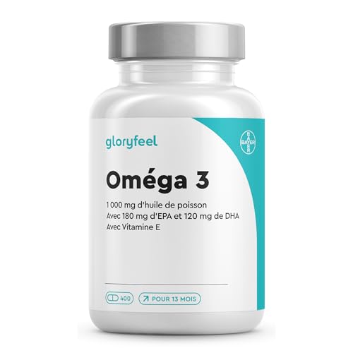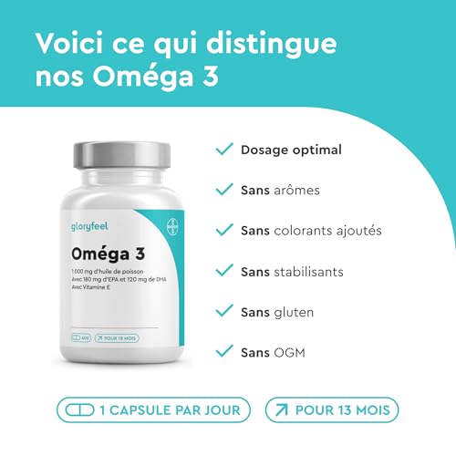 Spécification: Oméga 3 1000mg Huile de Poissons Sauvages, 400 Gélules Biodisponibles, EPA 180mg DHA 120mg pour +1 An, Haute Concentration Acides Gras, Soutient le Cerveau, Cœur, Tension Artérielle, Sans Additifs