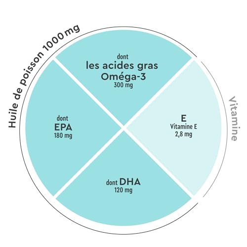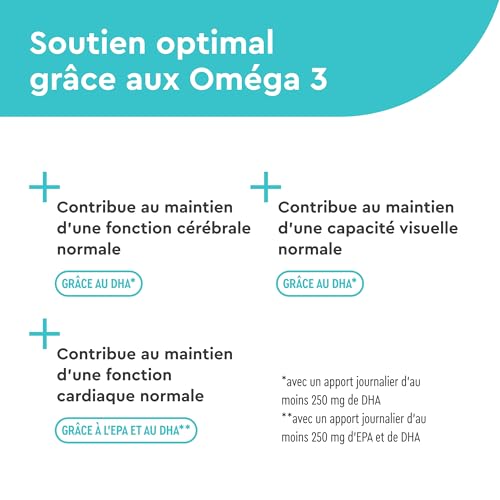 ✅ AVANTAGES DE L’HUILE DE POISSON OMEGA 3 – L’acide docosahexaénoïque (DHA) aide à maintenir les fonctions cérébrales et la vision normales et soutient les activités métaboliques. En combinaison avec l’acide eicosapentaénoïque (EPA) – l’EPA et le DHA contribuent à une fonction cardiaque normale et ont des propriétés anti-inflammatoires et antioxydantes (pour un apport quotidien de 250 mg de DHA/EPA).*