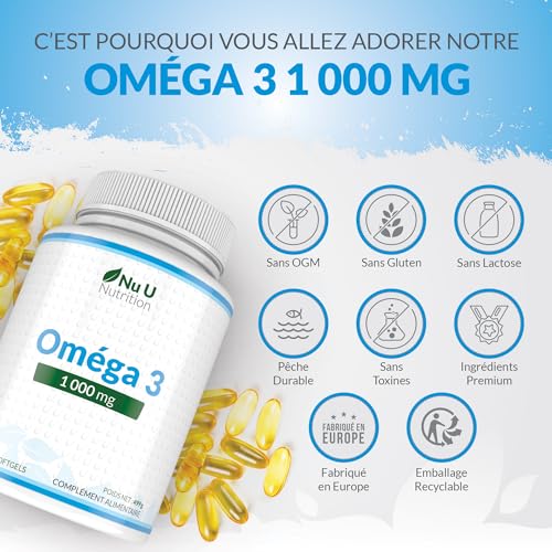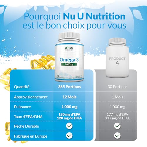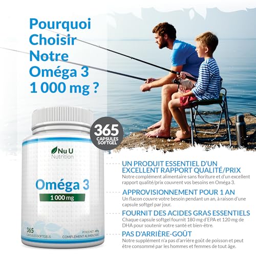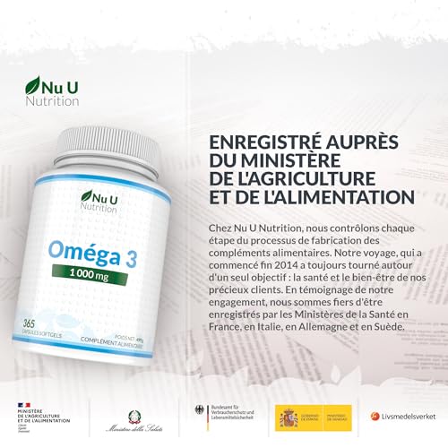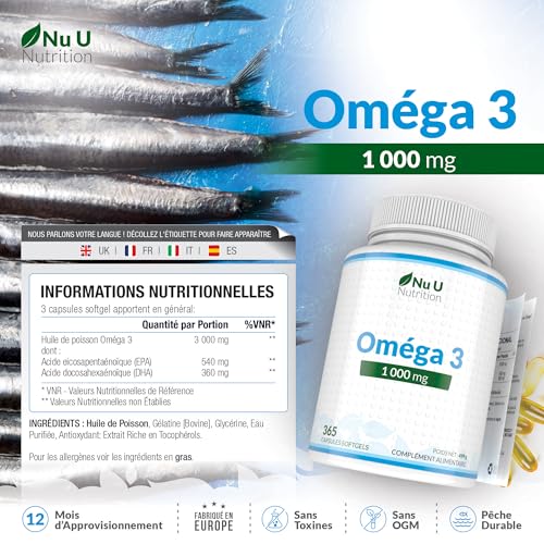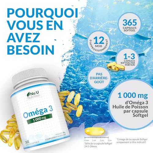 Spécification: Omega 3 Fish Oil 1000 mg – Huile de Poisson – 365 Gélules – Cure d’1 An – Riche en EPA 540mg et DHA 360mg – Compléments alimentaires de Nu U Nutrition