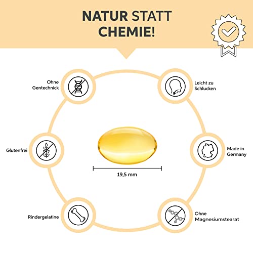 Gélules oméga-3 de qualité supérieure en forme de triglycéride – 3000 mg d’huile de poisson oméga-3 par dose quotidienne (2 x 3 capsules par jour). Rapport optimal EPA/DHA 1:2. Petites capsules de gel mou faciles à avaler.