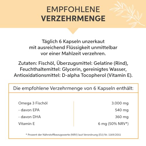 Spécification: Omega 3 gélules 200 pièces | Huile de poisson hautement dosée 3000 mg dose quotidienne avec 18 % d’EPA et 12 % de DHA | En gel souple naturel de triglycérides