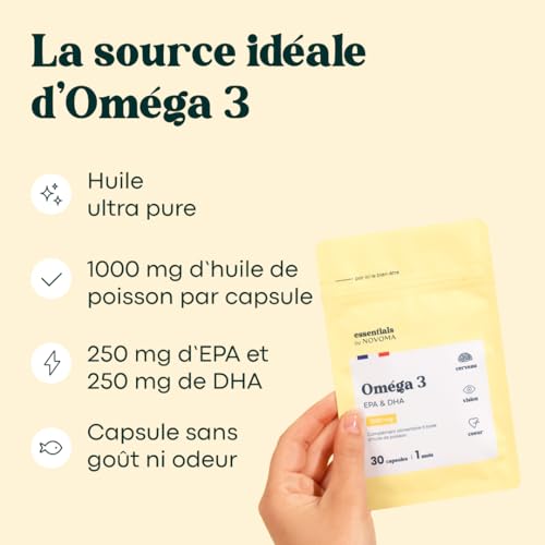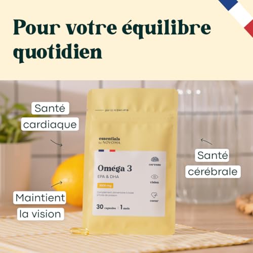 Spécification: Omega 3 Huile de Poisson 1000mg, Pure et Concentrée, Oméga 3 EPA DHA, Santé du Coeur & Vision, Cure de 1 mois, Fabriqué en France, Essentials by Novoma