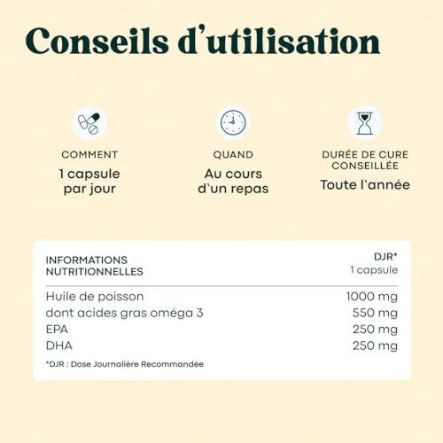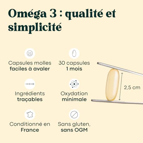 1 MOIS DE CURE. Pour profiter des bienfaits des oméga 3, il vous suffit de prendre 1 capsule par jour avec un verre d’eau. Avec 30 capsules, notre complément alimentaire contient donc 1 mois de cure.