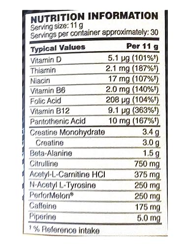 La formule pré-workout contient 250mg de Performelon, un ingrédient breveté issu de la pastèque contenant de la L-Citrulline qui augmente l’afflux sanguin et donc l’oxygène apporté aux muscles. Il améliore l’endurance anaérobie et aérobie et diminue la fatigue musculaire.