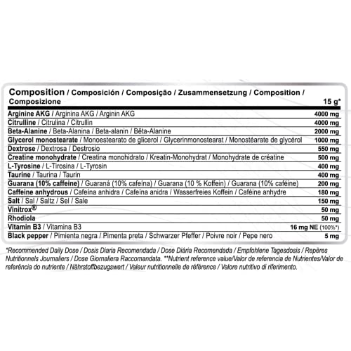 ✅ Pompage maximal des nutriments et vascularisation musculaire : amélioration significative de la puissance, de la force et de l’endurance pendant le sport grâce à la combinaison de monostéarate de glycérol, de dextrose, d’alpha-cétoglutarate d’arginine, de base de ciruline, de bêta-alanine et de Vinitrox (extrait de raisin et de pomme).