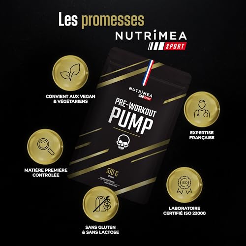 Les Bienfaits du Pre Workout Nutrimea Le Pre Workout Nutrimea permet de maximiser les performances physiques et mentales dès les premières minutes d’entraînement. Grâce à une formulation complète et rigoureusement dosée, il agit sur tous les leviers de la performance sportive : Améliore l’endurance : Grâce à la bêta-alanine, à la citrulline et à l’AAKG, le pre-workout agit directement sur la performance musculaire. Il limite l’accumulation d’acide lactique, prolonge votre capacité de s’entraîner intensément, et aide à repousser les limites. Retarde la fatigue musculaire : formulé à partir d’extrait de betterave naturellement riche en nitrates, qui aide à optimiser l’oxygénation des muscles et à soutenir l’endurance pendant l’effort. Il contribue également à réduire la sensation de fatigue, en favorisant un meilleur rendement énergétique. Booste la circulation sanguine pour un effet « Pump » immédiat : l’association citrulline + AAKG stimule la production d’oxyde nitrique, favorisant une meilleure vasodilatation, ce qui permet un afflux sanguin accru vers les muscles, une meilleure congestion et une sensation de puissance dès les premières séries. Énergie durable tout au long de la séance : avec 100 mg de caféine et des vitamines B3, B6, B12, le Pre Workout Nutrimea donne un véritable coup de fouet au début de la séance. Il soutient également la production d’énergie cellulaire et aide à rester performant du début à la fin. Focus mental renforcé et meilleure concentration : grâce à la L-tyrosine et à la caféine, il soutient la production de dopamine (Da) et de noradrénaline (NE). Idéal pour rester concentré, lucide et motivé, même pendant les entraînements les plus exigeants. Accélère la récupération post-effort : la citrulline et la taurine favorisent l’élimination des déchets métaboliques produits pendant l’exercice. Elles contribuent à une récupération plus rapide, permettant d’enchaîner les séances plus sereinement. Pourquoi choisir le Pre Workout Nutrimea ? Le Pre Workout Nutrimea allie performance, concentration et récupération. Sa formule ultra complète associe les meilleurs actifs du marché dans des dosages optimaux : citrulline, AAKG, bêta-alanine, caféine, taurine, tyrosine et vitamines B. Chaque ingrédient a été sélectionné pour son efficacité prouvée : effet « pump » immédiat, énergie durable, focus mental renforcé et fatigue repoussée. Au-delà de ses performances, le Pre Workout Nutrimea mise sur la transparence et le respect de vos exigences : sans gluten, sans lactose, sans colorants artificiels, et 100% vegan. Élaboré en France et certifié ISO 22000 avec des arômes naturels et un goût fruits rouges savoureux, il incarne l’équilibre parfait entre efficacité et plaisir. L’idéal pour se dépasser en toute confiance, sans compromis sur la qualité et l’efficacité.