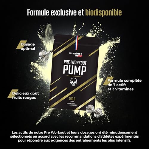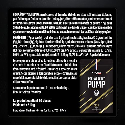 Spécification: PRE WORKOUT – Boisson PUMP Pré-entraînement – AAKG, Beta Alanine, Cafeine, Citrulline, Extrait de Betterave, Taurine, L Tyrosine – Vitamines B3, B6, B12 – Goût Fruits rouges – 510 g – Nutrimea